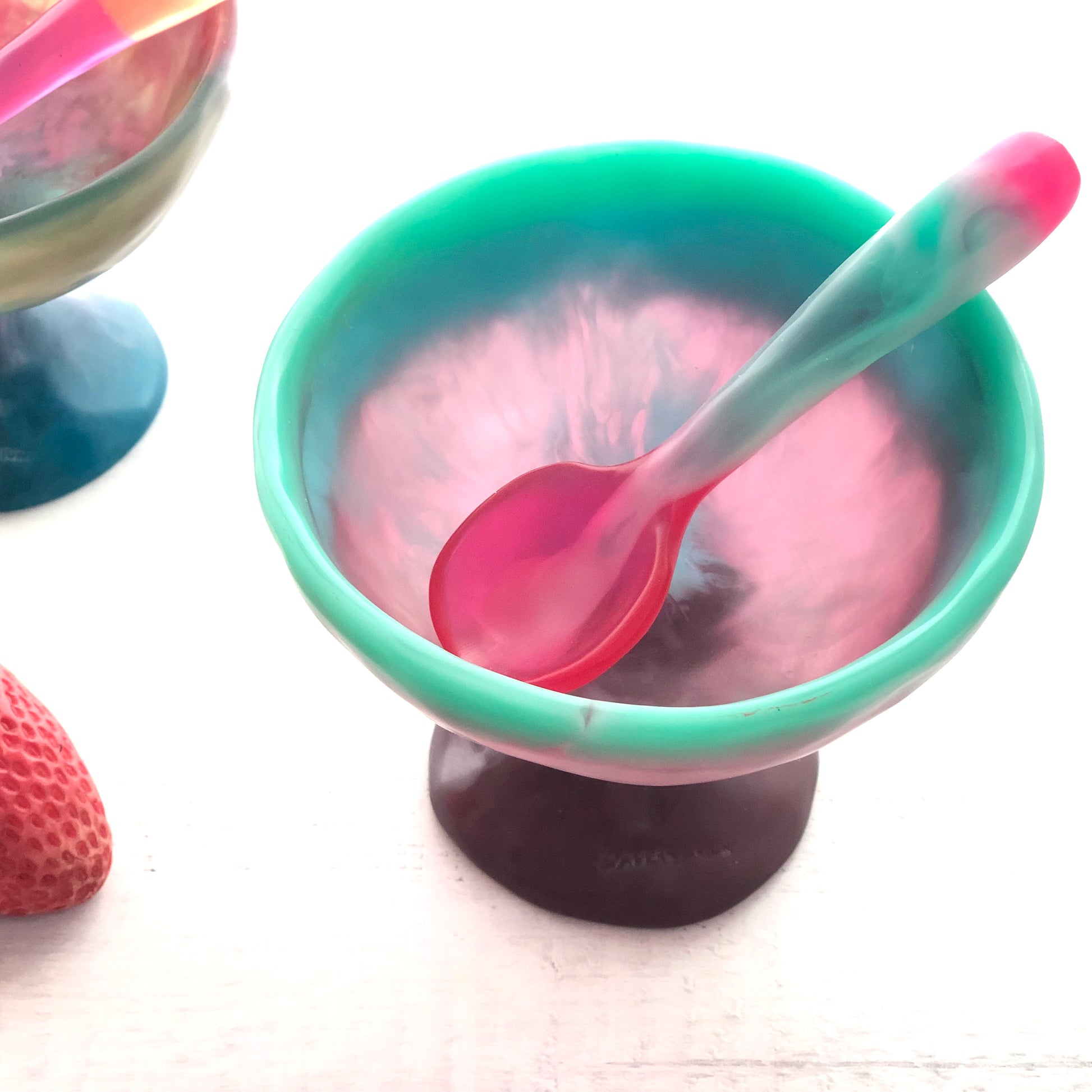 1 TAZA Postre o Helado 🥣 1 Cuchara Corta en Resina Especial 250 ml.